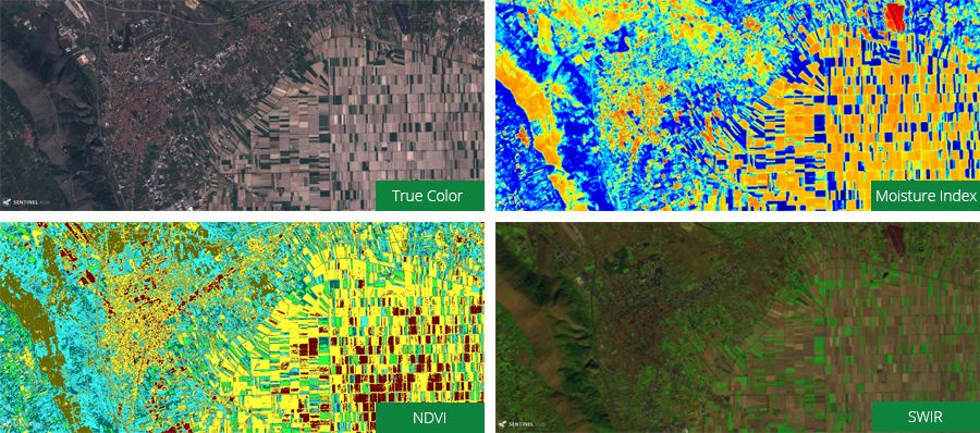 Data fra Sentinel 2 missionen kan også bruges til at bestemme hvilke type afgrøder, der dyrkes forskellige steder, og hvordan afgrødernes tilstand er.