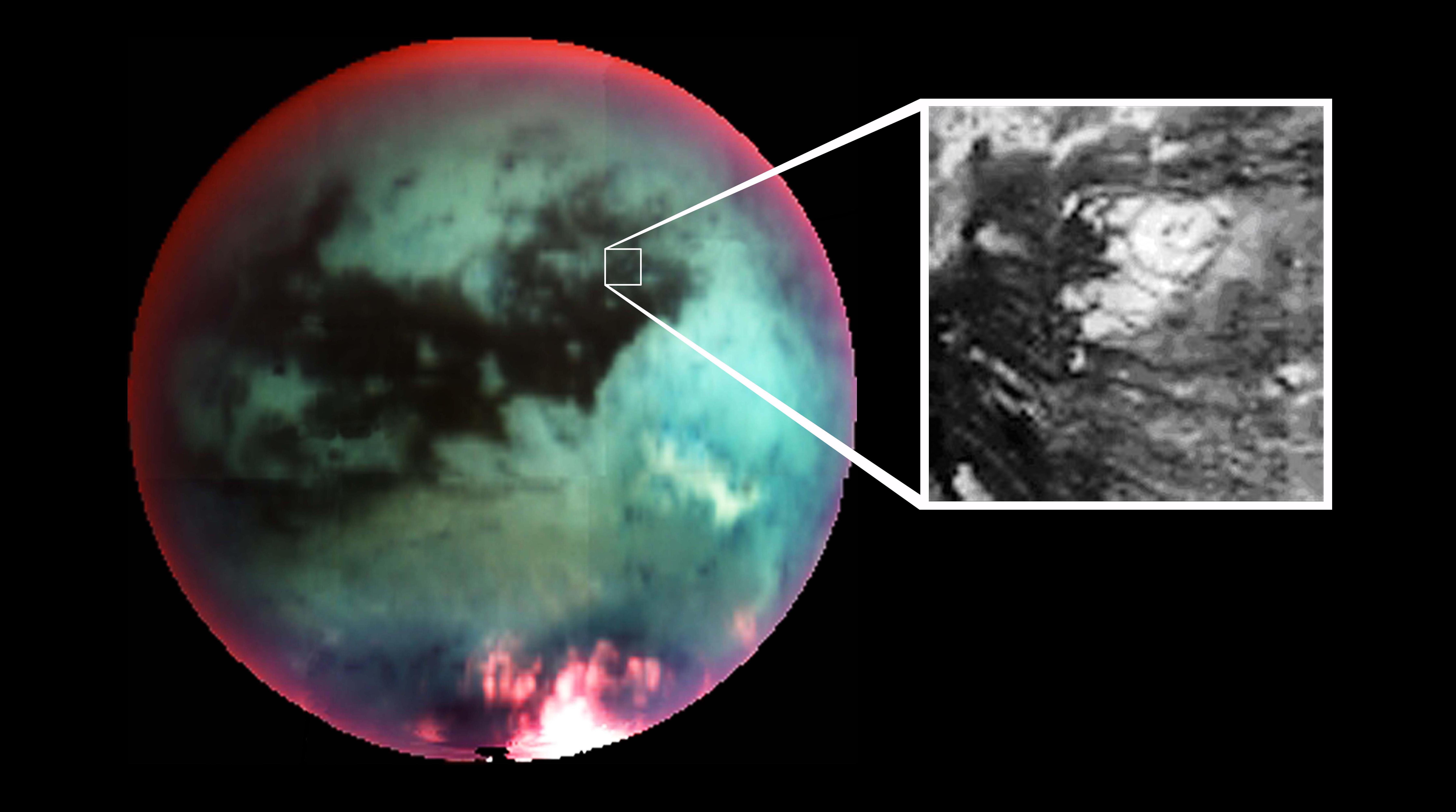 Billederne fra Huygens viser store, mørke flader, som meget vel kan være søer af flydende ethan eller metan. Fartøjets målinger tyder på, at der konstant falder en fin støvregn af metan over Titan.