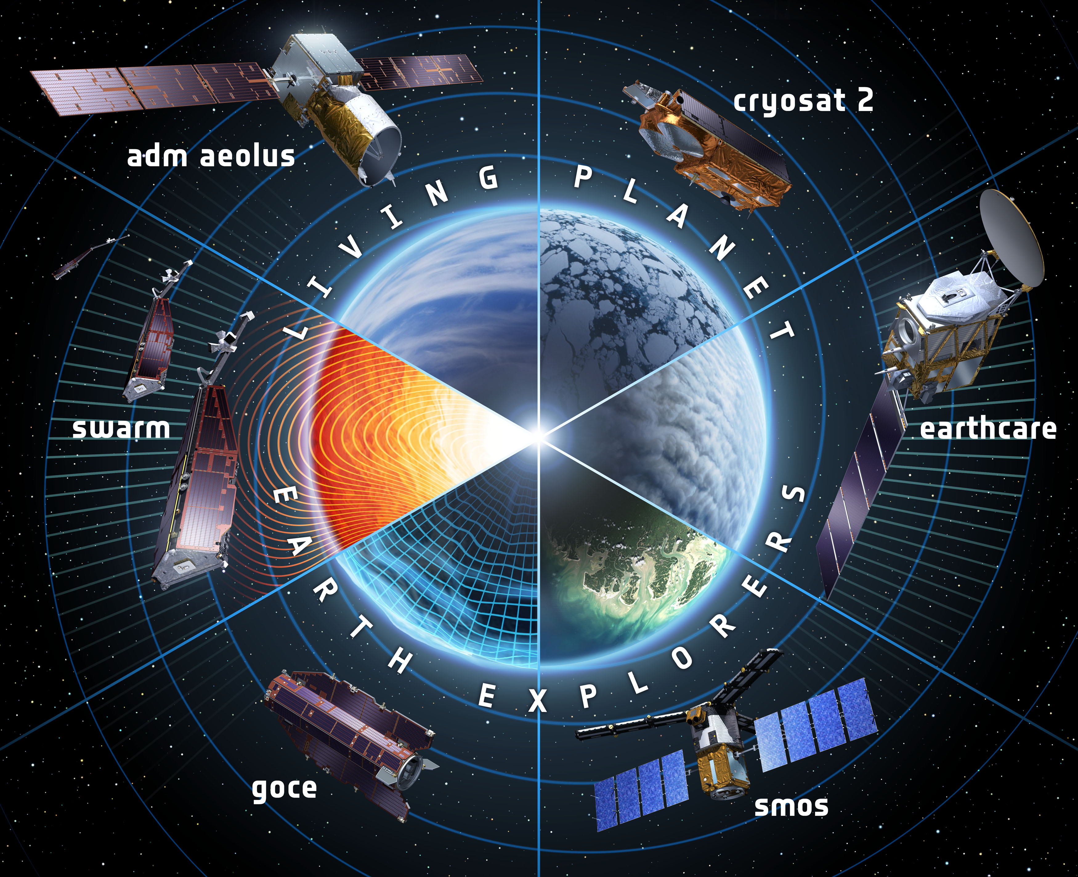 - Satellitter i såkaldte Lagrangepunkter, hvor de kredser om Solen sammen med Jorden og hele tiden har samme position til Jorden.