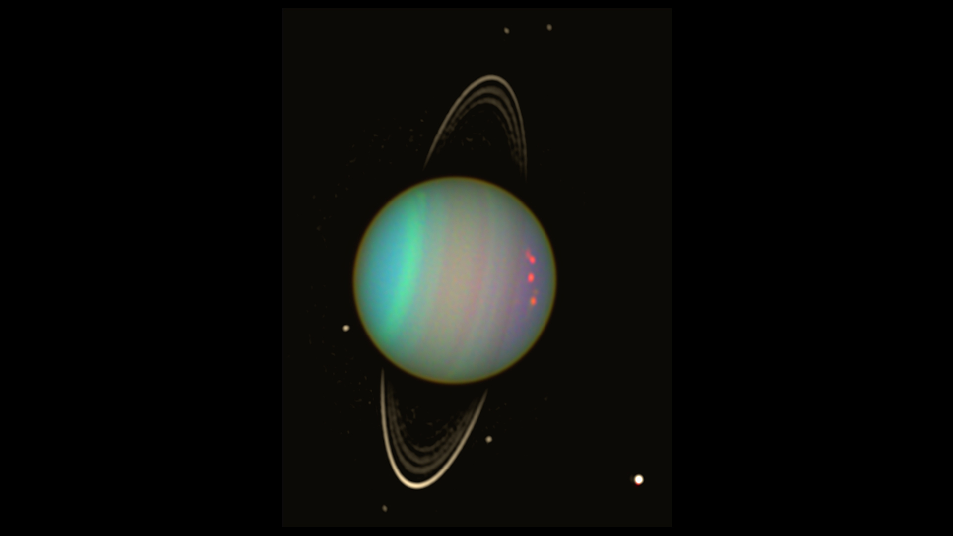 Uranus adskiller sig fra de andre planeter ved, at den så at sige ’ruller’ rundt om Solen. Jorden og de andre planeter roterer om en akse, der er mere eller mindre lodret. Jordens akse hælder for eksempel omkring 23 grader. Men Uranus' akse hælder hele 98 grader. Det betyder at den nærmest ligger ned og "ruller" rundt om Solen. Hvis det var Jorden, der roterede på den måde, så ville der være tropisk varmt ved nord- og sydpolen og polarkoldt ved ækvator. Det får du en forklaring på i videoen. (Video: NASA/JPL).
