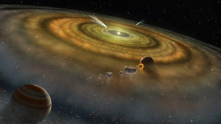 Forskerne forestiller sig, at Jorden i dens tidligste barndom blev bombarderet af kometer. Størsteparten af det vand, vi har her på Jorden, stammer muligvis fra dette store komet-bombardement. Men der er noget, der ikke helt stemmer. Vandet på Jorden indeholder almindeligt hydrogen, som kun har en proton i sin atomkerne. Men vandet fra mange kometer indeholder tungt hydrogen, som har en neutron og en proton i atomkernen. En anden forklaring kan være, at vandet på Jorden kommer fra asteroider. For på en asteroide som Vesta har man nemlig fundet en type vand, som den vi har på Jorden. Men forskerne har ikke det endelige svar på, hvor Jordens vand kom fra.
