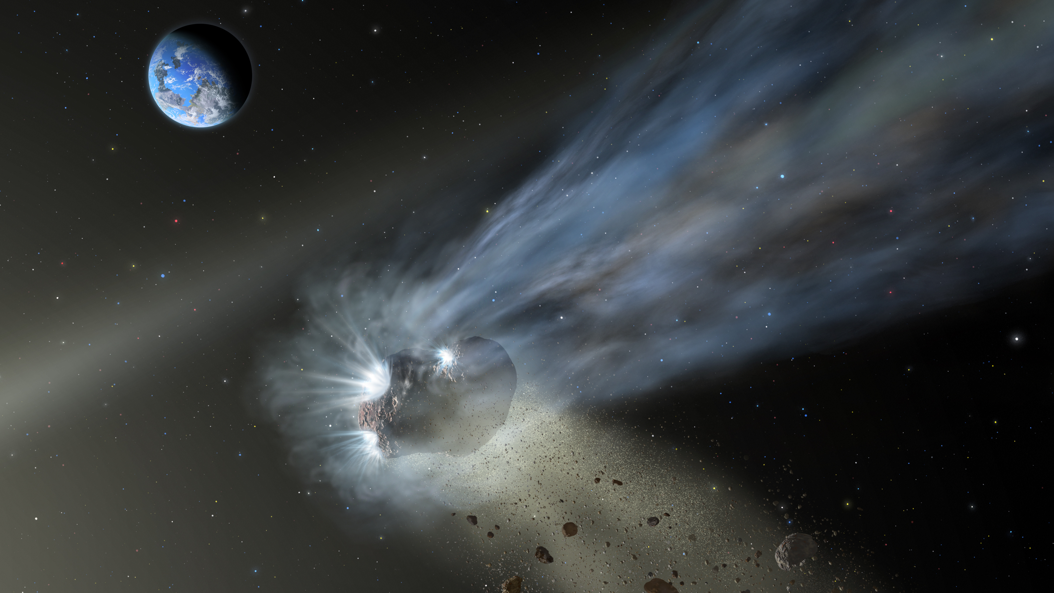 Kometer findes især i to områder i Solsystemets iskolde udkant; Kuiperbæltet og den enorme Oortsky. Herfra kommer de ind i mellem på strejftog ind i den indre del af Solsystemet, hvor Jorden befinder sig. Halleys komet er nok den mest berømte af de kometer, der med faste, men meget forskellige intervaller kommer forbi Jorden. Men der er mange andre kometer. Jorden er også flere gange blevet ramt af små kometer. I 1908 blev Tunguska i Sibirien ramt af en meteor-eksplosion så kraftig at den kan sammenlignes med 600 Hiroshima-atombomber. Hvis en større komet rammer Jorden, vil det have katastrofale følger for hele kloden.