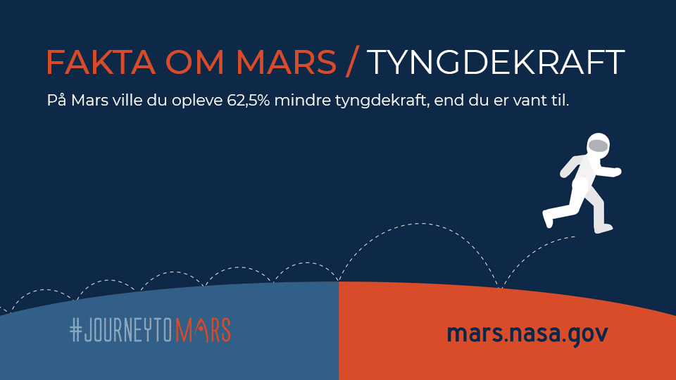Tyngdekraften på Mars er 62,5 % mindre end tyngdekraften på Jorden. Det vil sige, at Mars' tyngdekraft kun er 1/3 af Jordens. (Illustration: NASA).