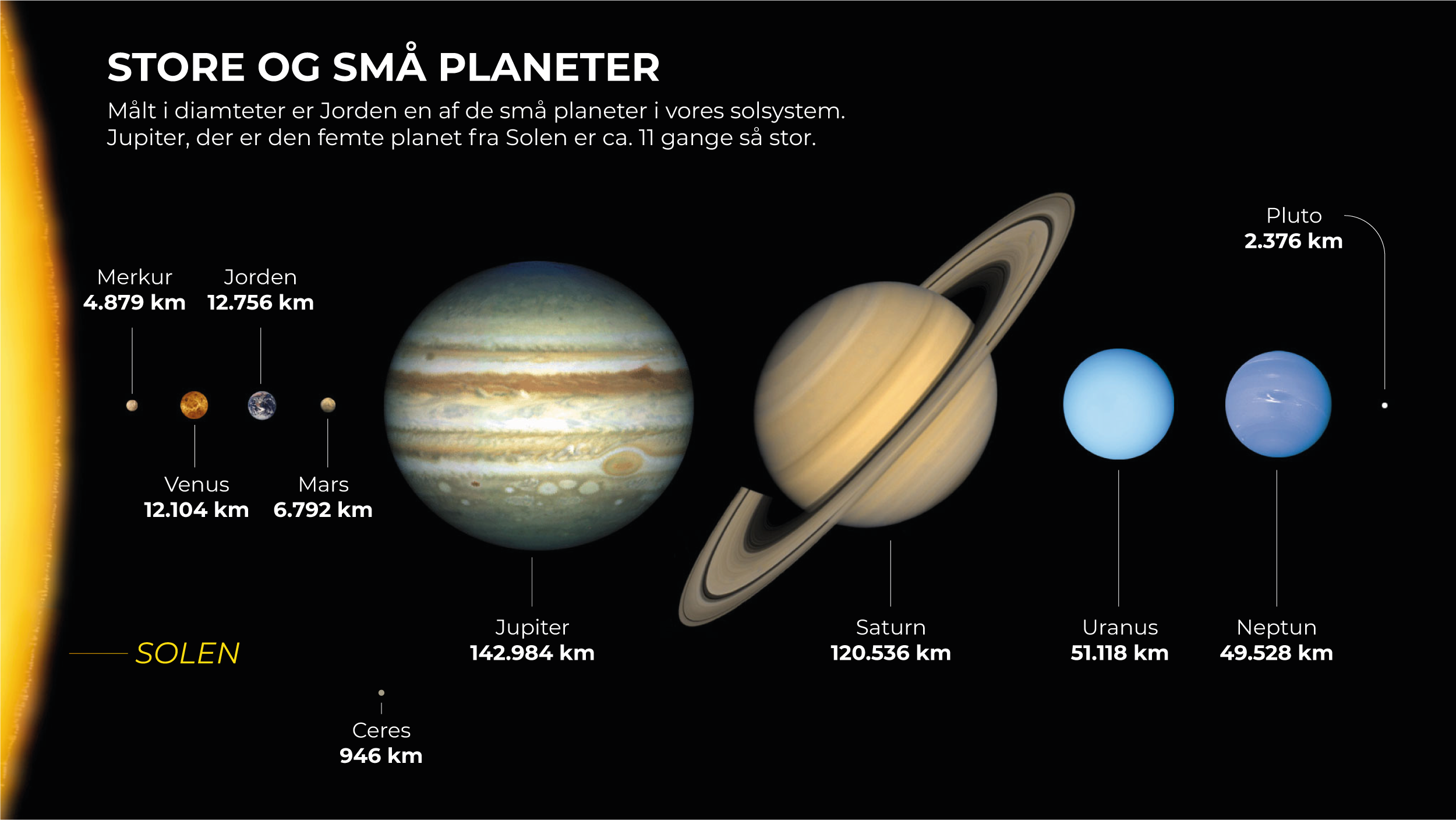 Jupiters diameter er omkring 11 gangs så stor som Jordens. Og Solens diameter er omkring 10 gange så stor som Jupiters. Plutos diameter er lidt mindre end en 1/50 del af Jordens. Planeterne er ikke vist i de indbyrdes korrekte afstande til Solen og hinanden. (Illustration: NASA)
