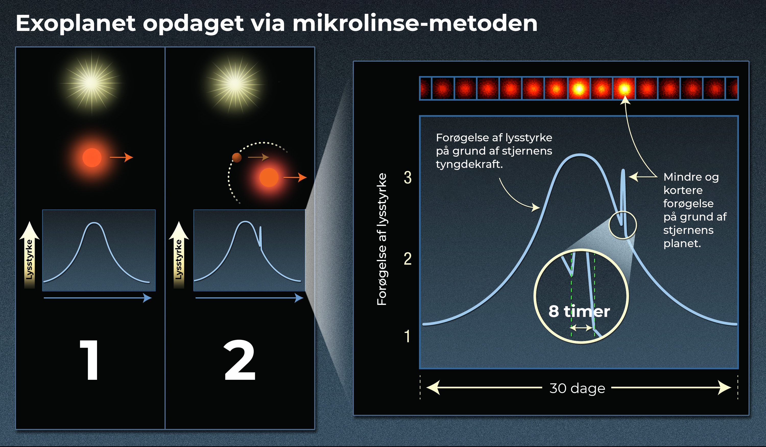 1: Når en stjerne passerer foran en anden stjerne, vil den forreste stjerne forstærke lyset fra den bagerste stjerne. Den forreste stjernes tyngdekraft krummer rummet og skaber det, man kalder en tyngdelinse, der fokuserer og derved forstærker lyset. 2: Hvis en planet kredser om den forreste stjerne, vil den med sin tyngdekraft også forstærke lyset fra den bagerste stjerne, men i mindre grad og i en kortere periode.