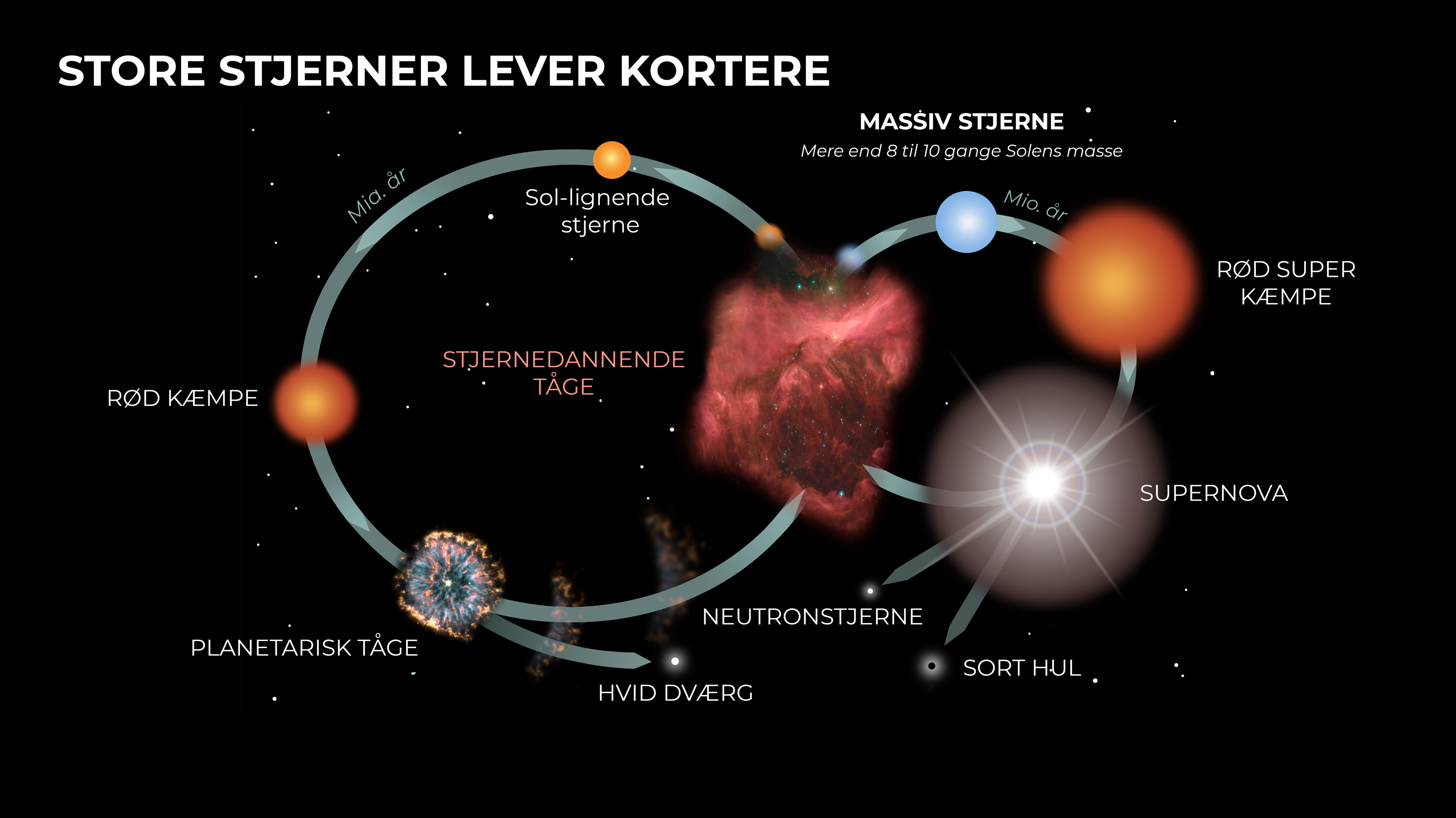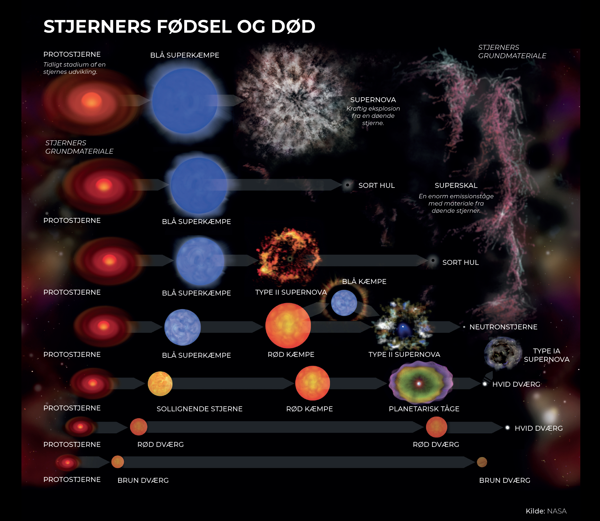 STJERNERS FØDSEL OG DØD. Illustrationen viser udviklingen af forskellige typer af stjerner. Pilene viser stjernernes levetid. De store stjerner brænder deres brændsel meget hurtigt. De har kort levetid. Små stjerner lever længere, fordi fusionsprocessen går langsommere. (Illustration: NASA).